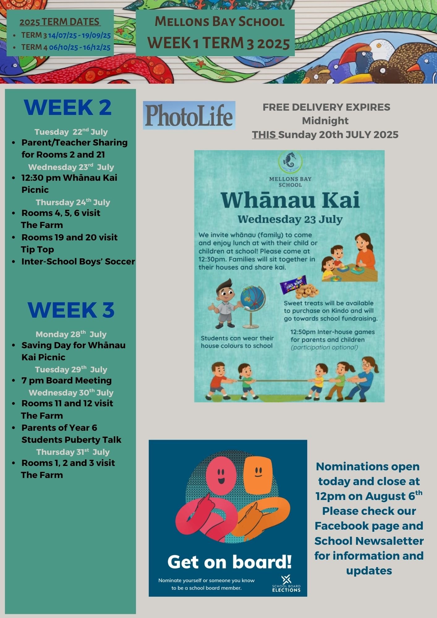 Mellons Bay School publishes a flyer every Friday, with the latest notices for the coming weeks.
